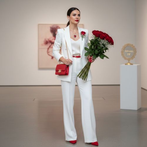 All-white outfit fresh, clean aur sophisticated feel deta hai. Valentine’s touch add karne ke liye bas red accents use karein—jaise red heels, red bag ya bold lipstick. Ye styling minimal bhi lagti hai aur festive bhi, bina overpowered hue.