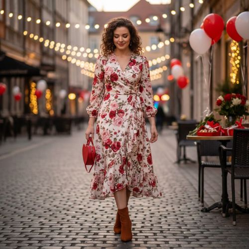 Floral prints Valentine’s Day ke romantic mood ke saath perfectly match karte hain. Midi-length floral dress flattering bhi hoti hai aur comfortable bhi. Is outfit ko aap heels ke saath dressy bana sakti hain ya ankle boots ke saath thoda casual look de sakti hain. Soft makeup aur loose waves is look ko aur bhi charming bana dete hain.