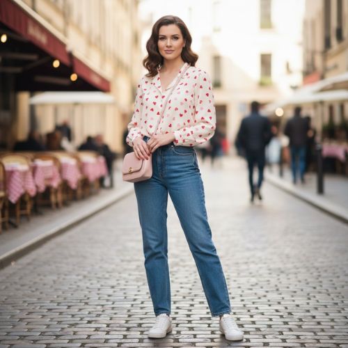 Heart prints Valentine’s Day ke mood ko subtly show karte hain. Ek heart print top ko classic denim ke saath pair karke aap cute aur relaxed look create kar sakti hain. Ye outfit casual dates, shopping ya day outings ke liye perfect rehta hai.