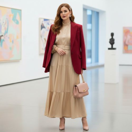 Red blazer ek powerful aur confident style statement deta hai. Jab ise white, beige ya nude base ke saath style kiya jaata hai, toh outfit balanced aur classy lagta hai. Ye look un women ke liye perfect hai jo romantic vibe ke saath strong, boss-girl energy bhi dikhana chahti hain.