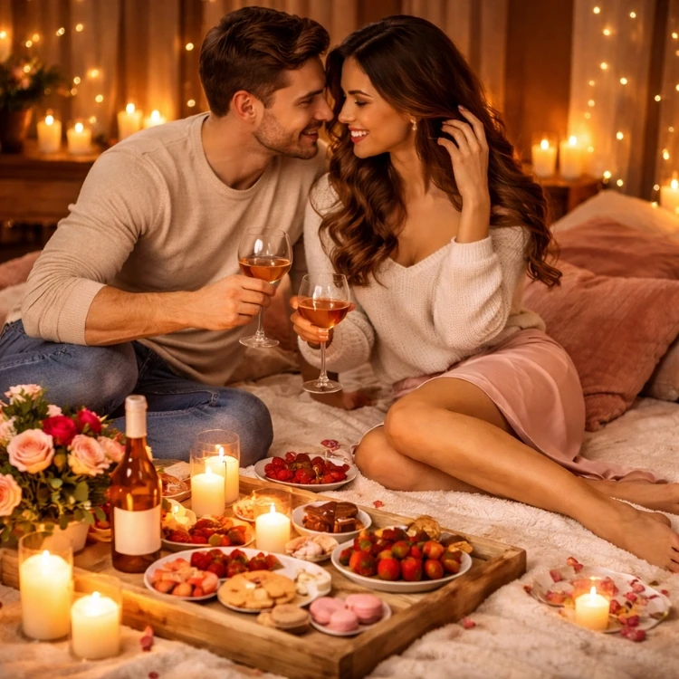 Set up a picnic indoors with flowers, blankets, candles, and heart-shaped decor. This works beautifully for small spaces and natural light setups. It feels romantic, creative, and cozy at the same time. Pinterest users love this setup because it’s easy to recreate.