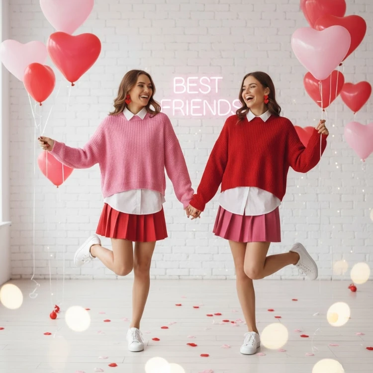 Valentine’s Day isn’t only about couples. Matching outfits or coordinated colors work best for best-friend shoots. Fun poses and laughter make the images feel genuine. This idea is extremely popular on Pinterest.
