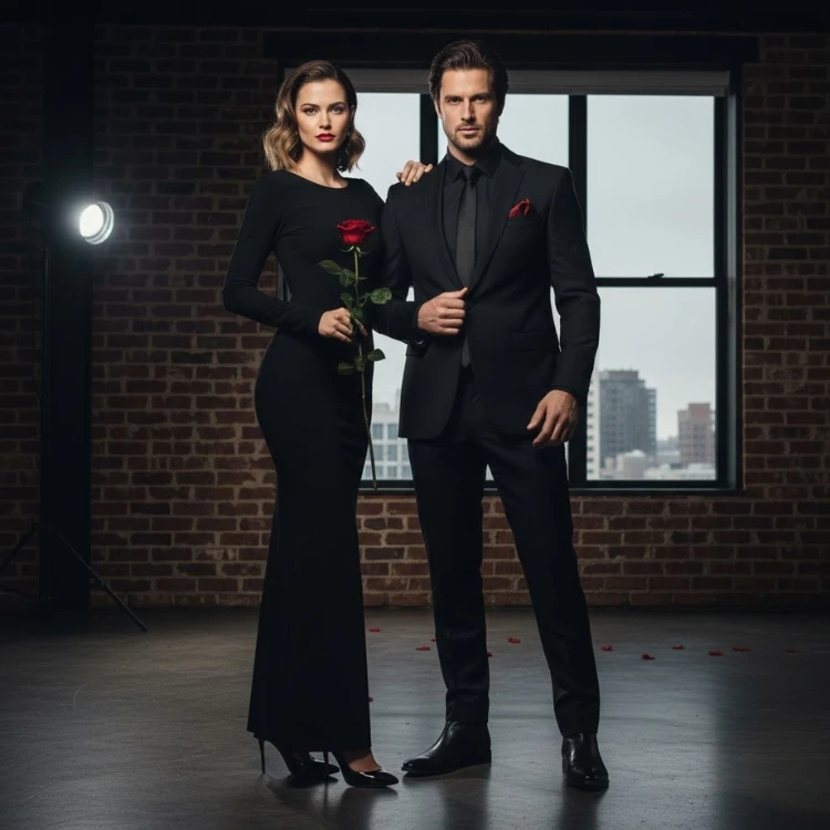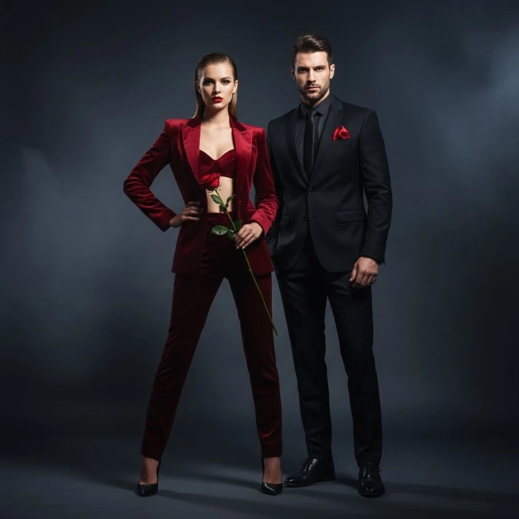Mix black outfits with red accents like roses, lipstick, or heels. This creates a dramatic, editorial-style shoot that feels high-fashion. Perfect for creators who want bold, magazine-style photos. Use strong lighting and confident poses.