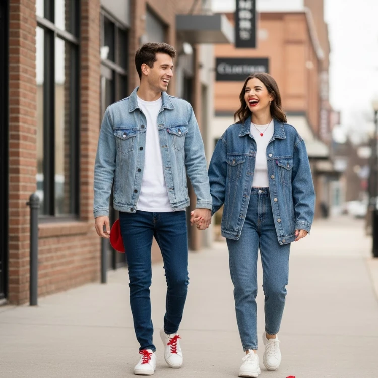 Denim jackets, jeans, and white tees make the shoot feel youthful and effortless. This is perfect for outdoor or urban shoots. It appeals strongly to Gen-Z and minimalist fashion lovers. Add subtle red accents for Valentine vibes.