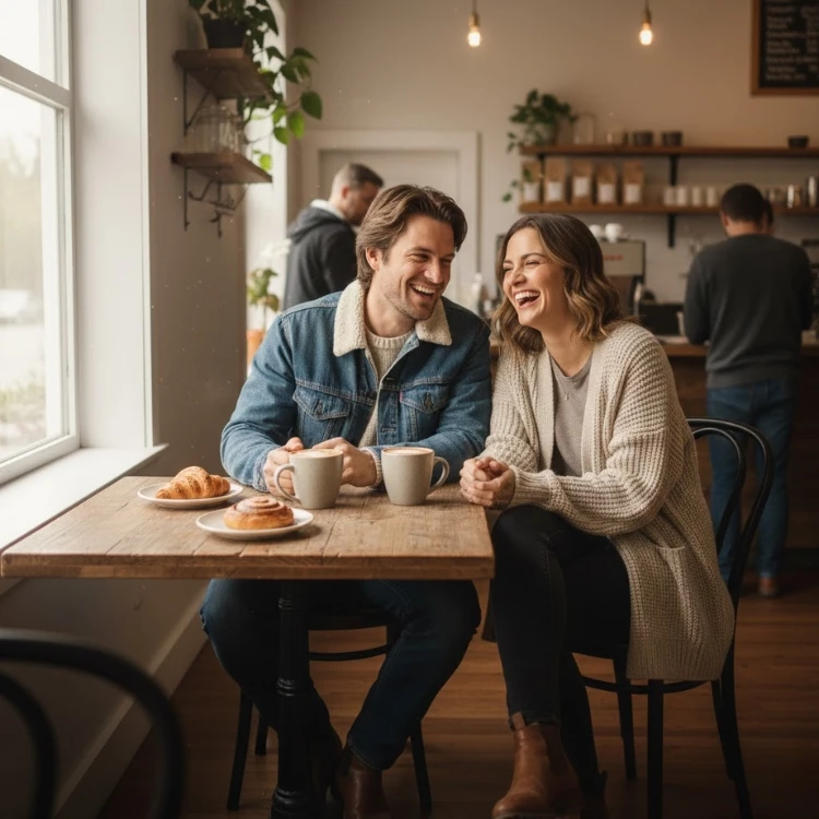 Recreate a café date at home or at a real coffee shop. Use mugs, pastries, and casual outfits like denim, knits, and boots. The relaxed vibe makes the photos feel approachable and modern. This is ideal for couples who prefer a laid-back romantic style. Candid laughter shots work best here.