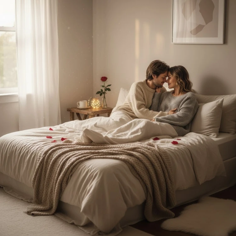 This idea focuses on intimacy and comfort. Think neutral bedding, cozy sweaters, natural makeup, and soft morning light. It gives an authentic, lived-in feel that audiences love. Perfect for couples or self-love shoots, especially for lifestyle creators. This style performs extremely well on Pinterest due to its realism.