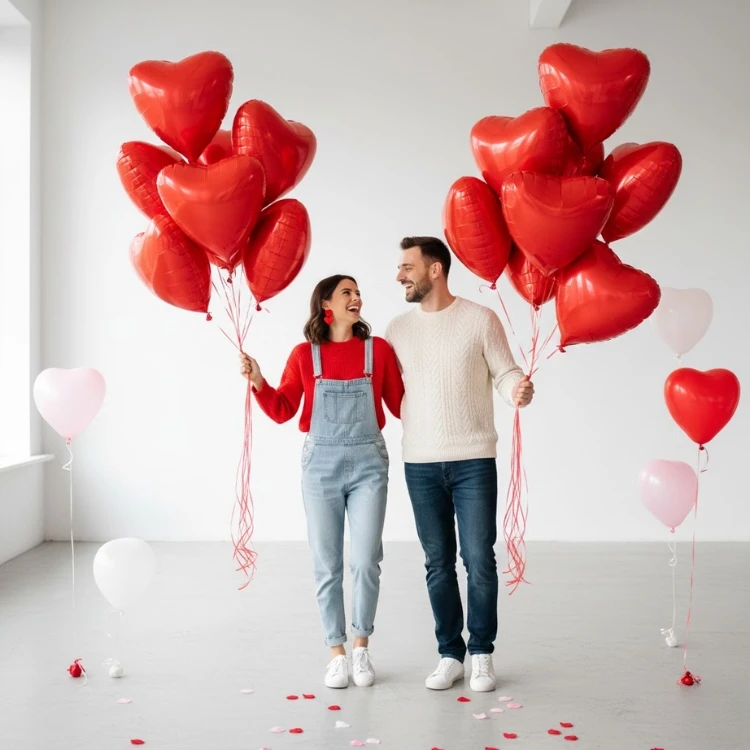 Use heart-shaped balloons for a playful and fun shoot. This works great for both couples and solo creators. Bright colors add energy and Pinterest appeal. Best shot in open spaces or simple backgrounds.