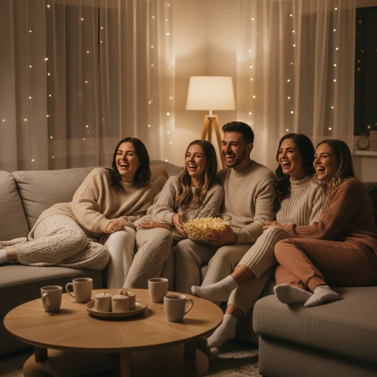 Fun, cozy, and very relatable. Perfect for couples or best friends. Soft fabrics and neutral tones work best. This idea feels authentic and cozy.
