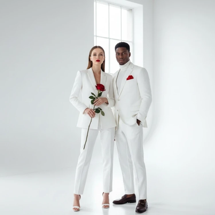 White outfits create a clean and modern Valentine look. Add subtle red details like lipstick or flowers. This style feels fresh and editorial. Perfect for fashion-focused creators.